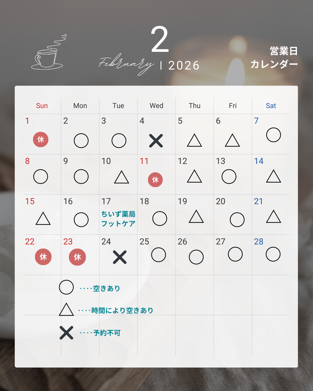 いつもサロンをご利用くださりありがとうございます。 2月のスケジュ-ルをおしらせいたします。 冷えやすく、むくみが気になりやすいこの季節。 骨格を整え、足元から巡りを促すことで、身体全体がすっきりと軽やかに整います♪ 疲れをため込む前のメンテナンスに、ぜひご利用ください。 ご予約はお早めにどうぞ🌷